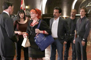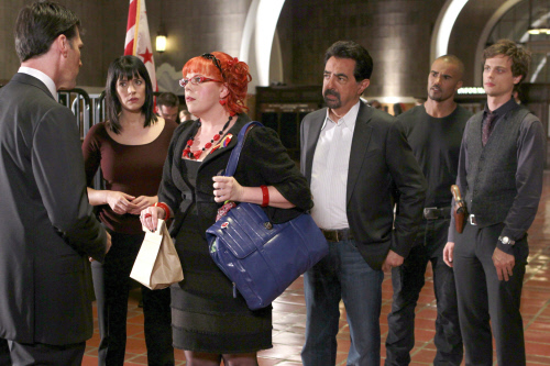 Au milieu de l’équipe en costumes de ville, une flamboyante rouquine qui ne se trouve jamais dans le terrain. Elle trouve tout ce qu’on lui demande sur son ordinateur ( Kirsten Vangness en Pénélope Garcia, le personnage le plus curieux de la bande – photo RTS)