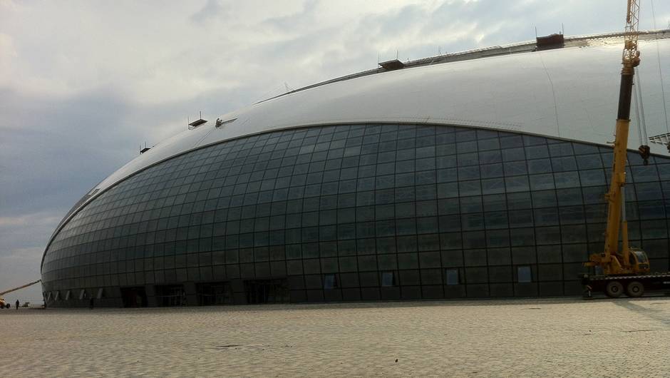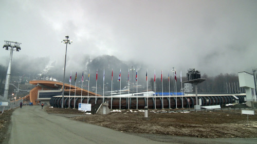 Quand Poutine fait ses jeux : le tremplin de saut est construit sur terrain instable, selon des témoins. Mais on ne sait pas si les piliers de consolidation ont été mis en place ! ( photo ARTE)